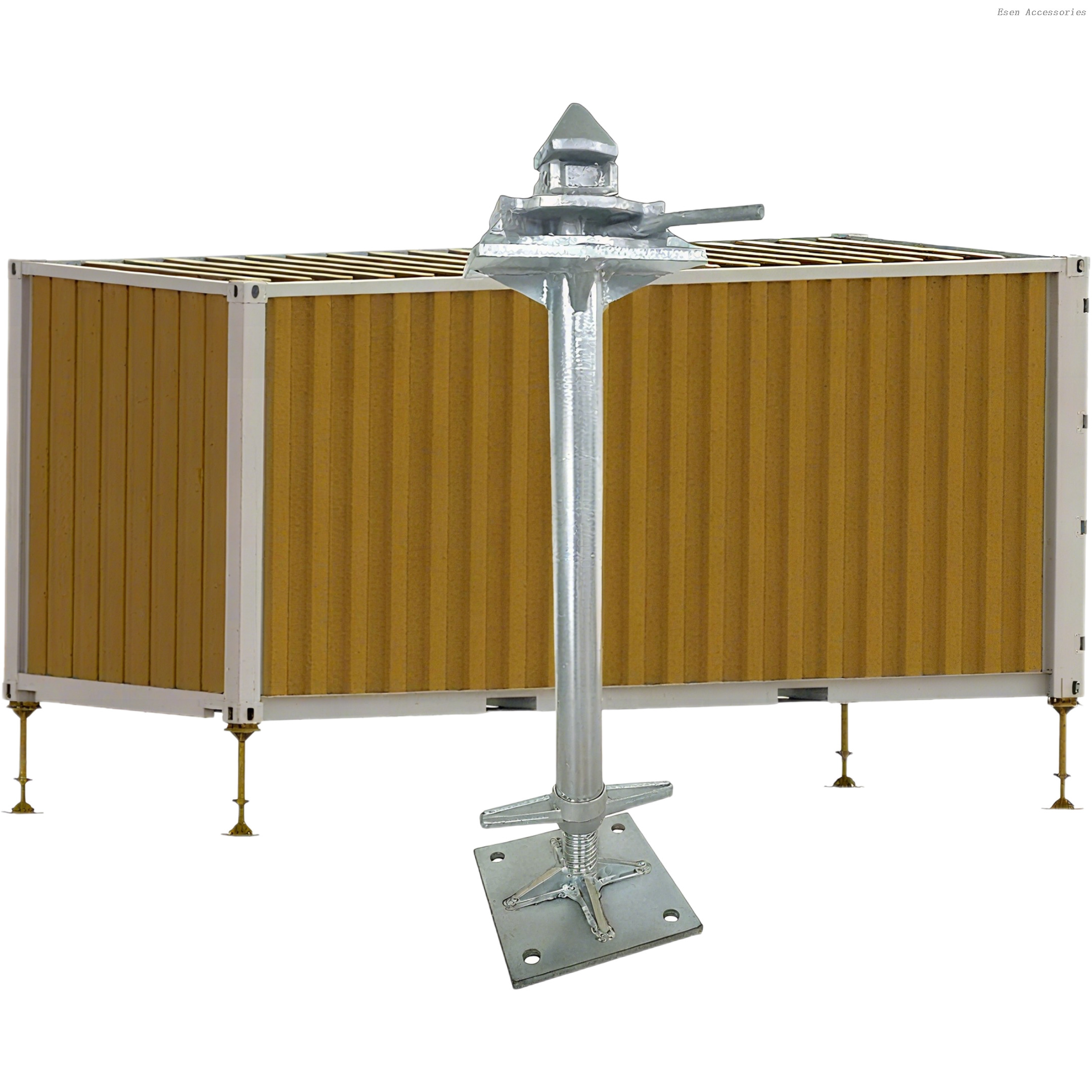Esta pierna de bloqueo de nivel de nivelación ajustable puede ajustar la altura del contenedor, elevándola en 580 mm. Es altamente adecuado para un terreno desigual o inclinado y también se puede usar para soportar el contenedor.
